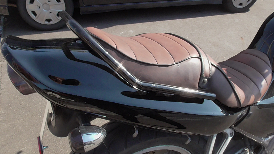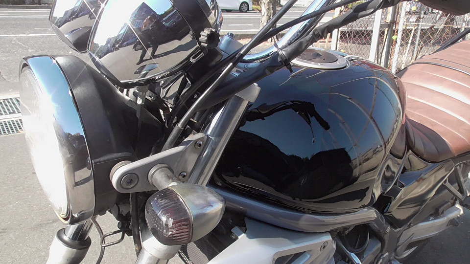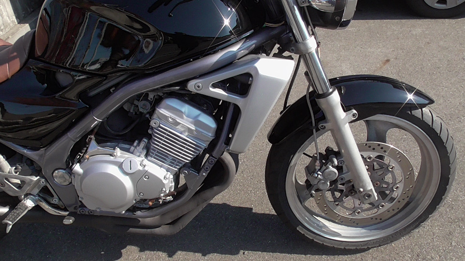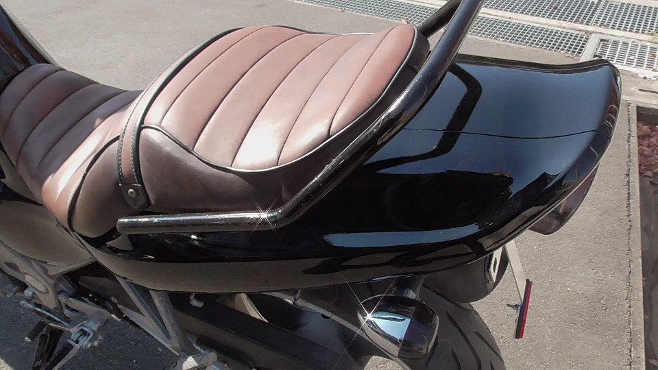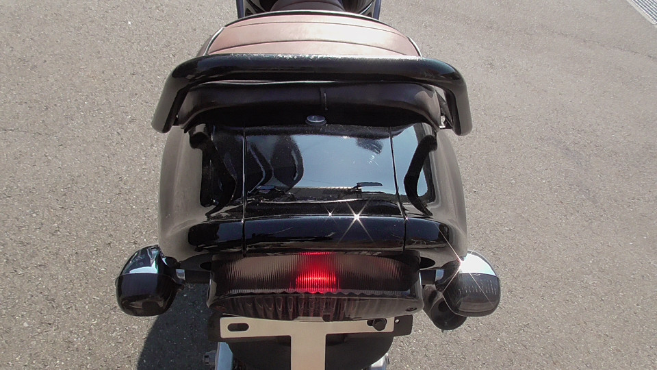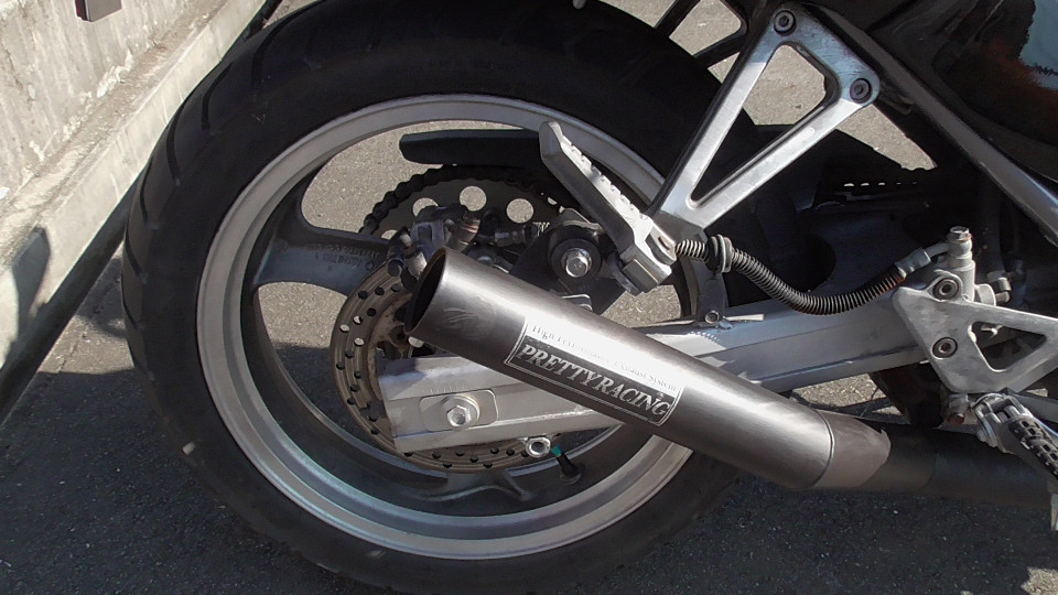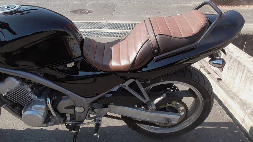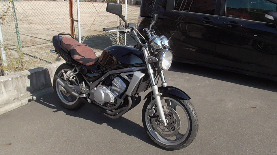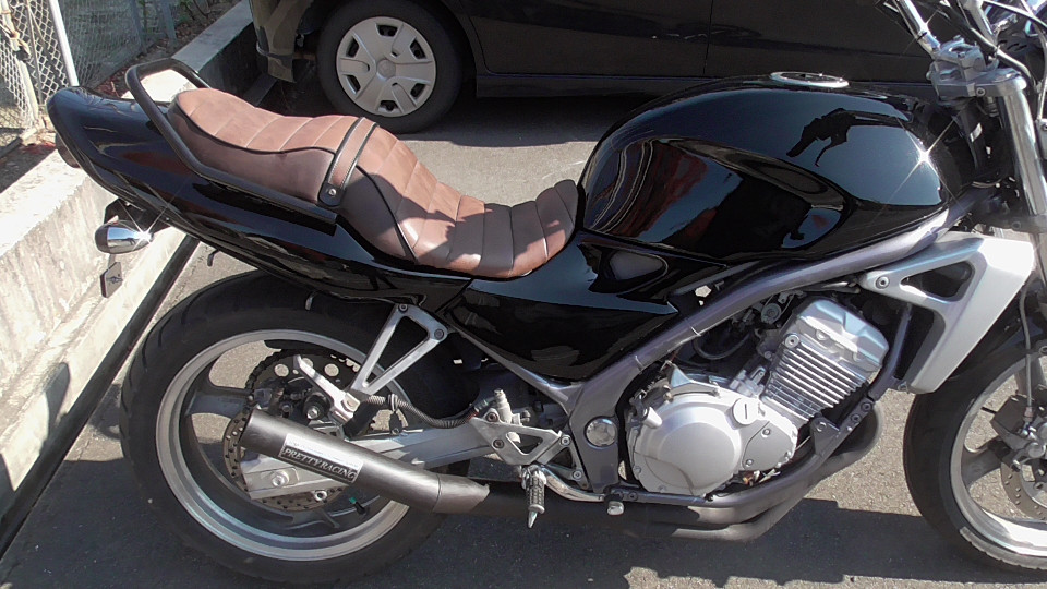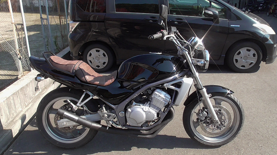 商品ID:1763608377:人気のバリオスブラック!ビンテージ風タックロールシートでオシャレ感アップ!アップハンドルでリラックスできるライディングポジションになってます。PRETTYRACINGマフラー。スペアキー有。